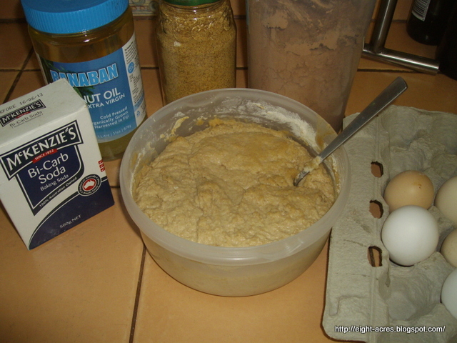 - In the afternoon I then combined 1 cup of rapadura sugar, 1 cup of cocoa, 1.5 tsp of baking soda, 1 cup of coconut oil, a splash of vanilla essence and 2 eggs. I then mixed in the starter mixture. It was very think and difficult to mix, I didn't want to ruin it by mixing too much, so it ended up a bit of a marble cake :)
