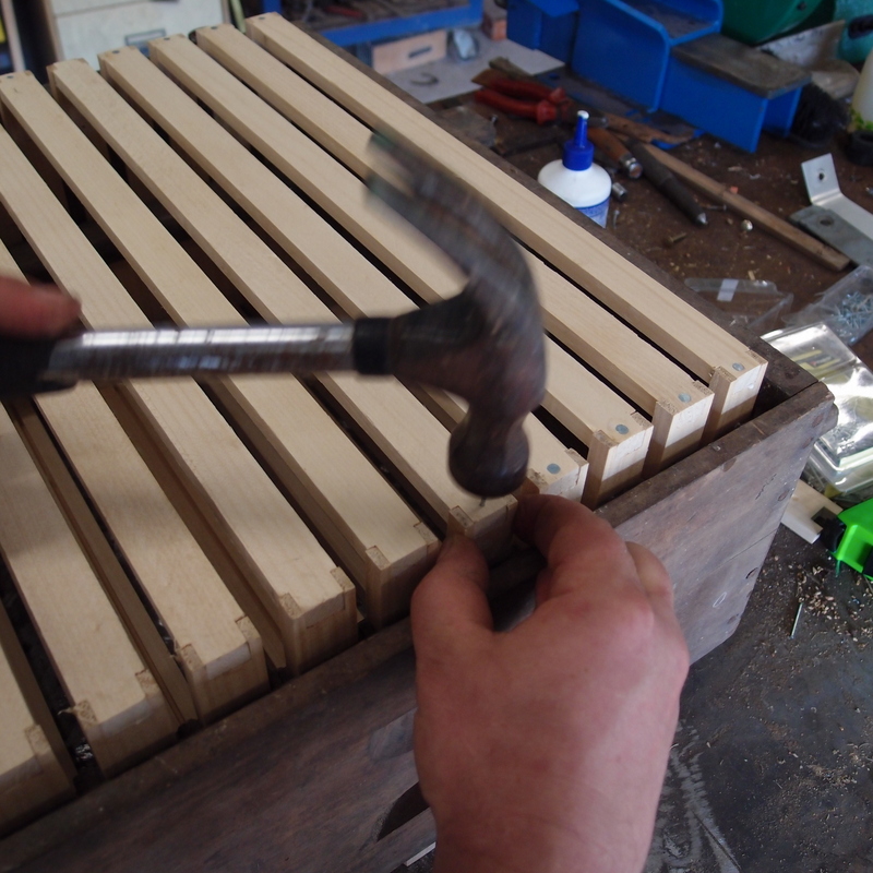Finally, he takes each completed frame out of the box and puts another nail in each end perpendicular to the first. We store the frames in empty bee boxes, ready to attach the wire and foundation (find out more here).