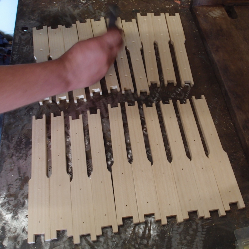 First, Pete punches the pre-drilled holes in each frame. These are used to hold the wires (more about wiring the frames here). Then he loads each of these side pieces into the slots in his box. Two pieces of wood slide into slots in the box to hold these pieces in place.