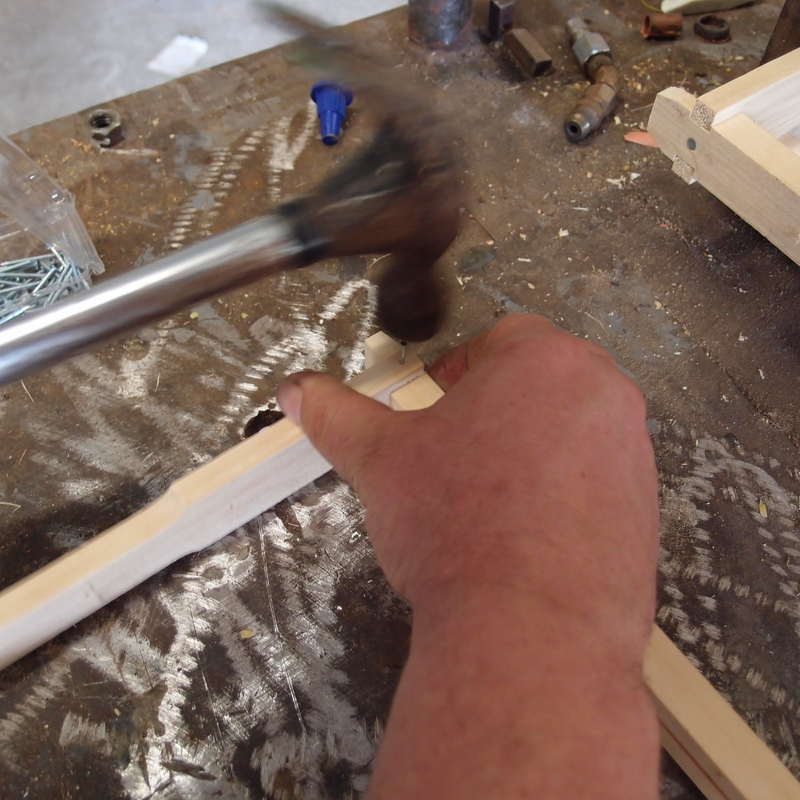 Then Pete will put a little PVA glue in each notch and push a horozontal piece into place. Each frame gets one nail on each side (some people put two nails, maybe we will learn that the hard way if these frames fall apart!).