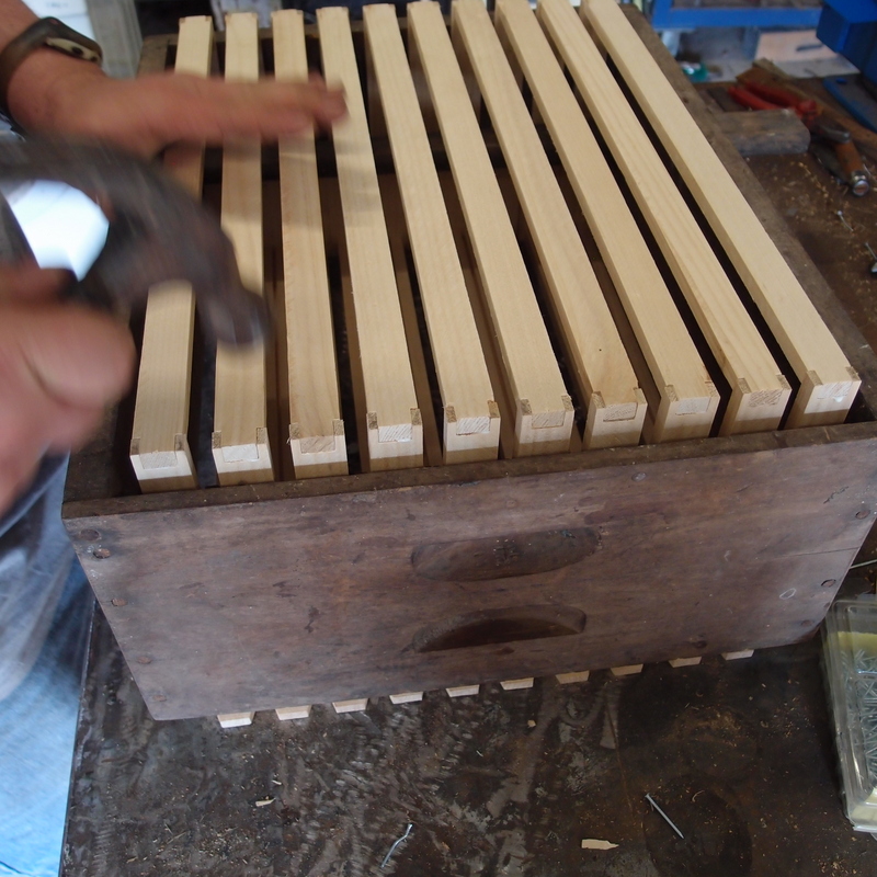 When all the frames are nailed, he flips over the box and repeats the process on the other side of the frames.