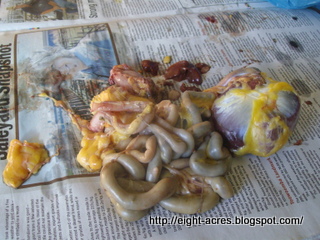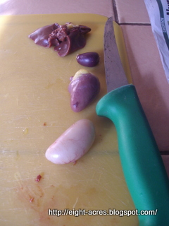 I kept the two livers and the kidneys in a bag in the freezer (until I have enough livers – and courage – to try the recipe). This time I also kept the necks for when I make stock. I did consider keeping the feet, but they were so dirty, dirt under the nails and everything, I didn’t feel like trying to clean them. I was also going to bury the intestines, feet and heads in a hole in the garden (as its dog proof) instead of throwing them away, but I forgot and they got bundled into the bin again. At least we kept more than we usually do.