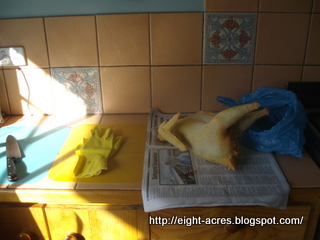 This post does contain photos of dead chickens and bits of chicken guts in the interests of explaining how we kill, gut and butcher our own homegrown chickens. I make no apologies for this, just warning you. If you are considering killing a chicken, you should be able to at least look at the photos, or you're going to get a shock when you get started. If you have done it before it will be nothing you haven't see before and you might be able to give me some tips.