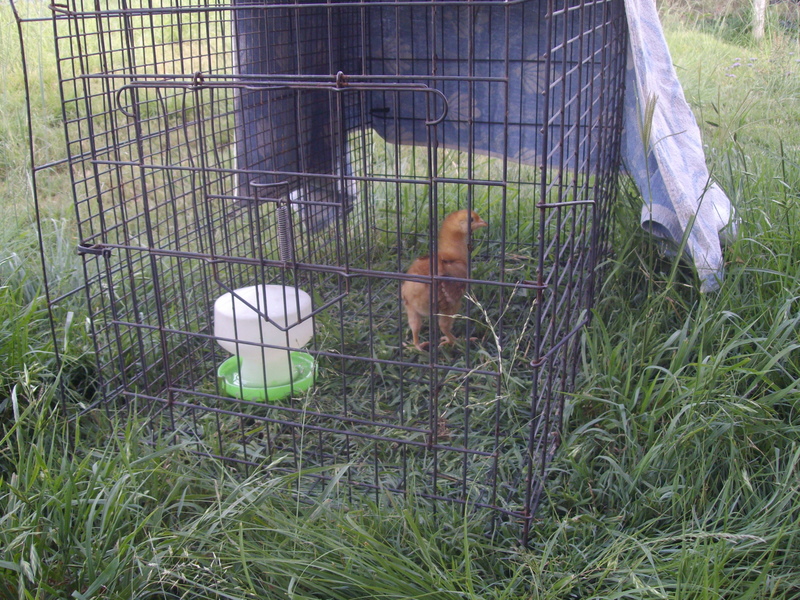 Depending on the time of year, the chicks only need the heat lamp until they have a few feathers. Particularly in summer, we can turn off the lamp after a week and after two weeks they can go outside in a small bird cage. I put them in the garden during the day (just in case the kelpies take an interest in getting the cage open) and out on the grass in the afternoon and then under cover at night. They seem very happy with that! When they are big enough not to climb out of the chicken tractors we put them into the smallest tractor and watch them GROW.