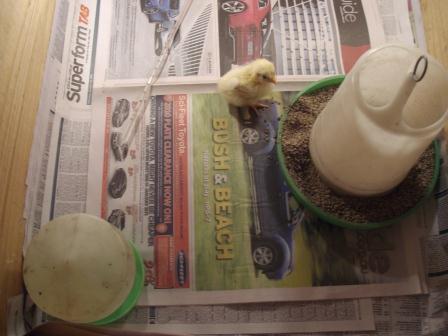The chicks will also need food and water. We get a little "waterer" rather than a dish as they are so small they could hop in and drown in a dish. We also give them a small feeder so they don't mess up the food so much. We feed them chick crumble for the first few days, then a little cracked grain (borrowed from the cattle) and then some mixed grain, until they are big and hungry. After a few days they can also have a little greenery, such as grass, lettuce or silverbeet. When the chicks first hatch they don't need food and water right away, they can stay in the incubator for 24 hours to recover in the nice warm environment before they go into their new brooder box. As soon as the chicks go into the box we try to teach them to eat by tapping the floor of the box with an index finger as if its a chick pecking at the food. When we see them start to eat we know that they're going to be ok. This is best when there are a few chicks, as at least one will be smart enough to figure it out so that the others can copy, with one chick, you just have to hope he's a smart one. I also show them the water by putting a drop on my finger and putting on the chick's beak.