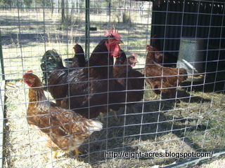 In another tractor we have Wilbur the Rhode Island Red Rooster from last year, with 5 of last year's hens (and some older) and our little "Beavis Brown" cross that we hatched last spring.