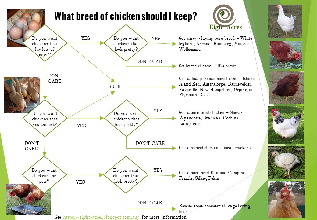 - If you are going to breed chickens, its much easier to have one breed or type of chicken to do everything you want chickens to do, then you don’t have to worry about keeping multiple roosters and keeping flocks separate. However, if you have the space to also consider multiple types of poultry, for example, keep a laying hen breed, and turkeys for meat. Or ducks for eggs and chickens for meat, that is another solution. Different poultry eat different bugs, weeds and cause varying damage to mulched gardens. One of the main ideas of permaculture is to have each element perform many functions and each function satisfied by many elements. It also aims to develop a system with minimal work, and keeping too many different types of special chickens is extra work!