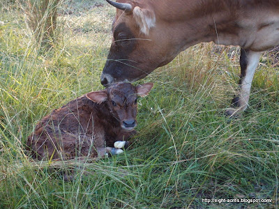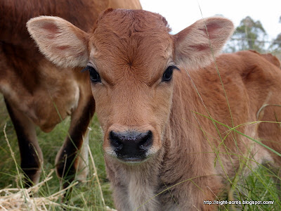 We froze the first few days of colostrum, until we ran out of old milk bottles, and we tipped the excess down the sink (terrible waste, I know, we need pigs!!). The frozen colostrum will be useful if we have an orphan calf that needs colostrum. We gave Monty frozen colostrum when Molly wouldn't let him nurse at first, so it can be very useful to have some stored, to ensure that the calf receives colostrum as soon as possible. The colostrum does not necessarily need to come from the calf's mother, colostrum from your own property or a nearby property is ideal, as the cow is likely to have the antibodies that the calf will need in the local environment.