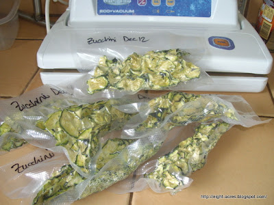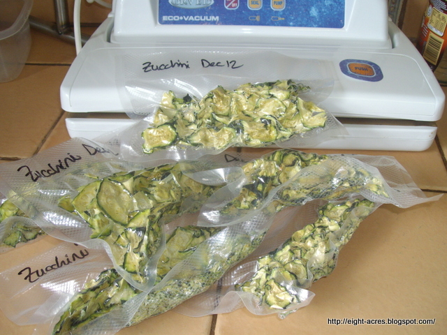 I sliced the zucchinis using the slicer on my grater, which was very quick and produced a nice thin slice. Then I laid them out on the dehydrator trays, about 1 zucchini to a tray. I ran the drier on and off for several days until the zucchinis were dry enough. I then sealed the chips in vacuum bags, so that they will last longer. I hope to be able to get these out occasionally in winter when we miss zucchini, so they can be added to soups and stews.