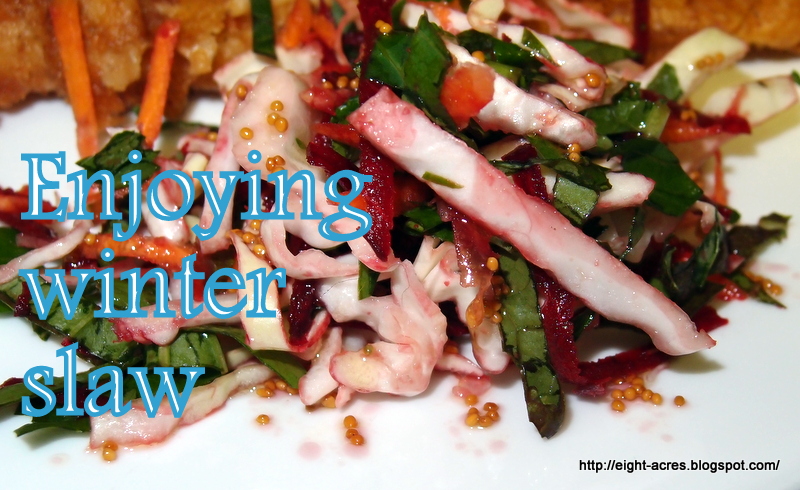 Over winter we often find ourselves with a surplus of cabbage. One thing that I like to make is coleslaw (or just slaw for short). The coleslaw I remember as a child was just shredded cabbage, grated carrot and grated cheese (sometimes also raisins, apple and/or walnuts), saturated in mayonnaise. Lately I have been experimenting with other ingredients.....