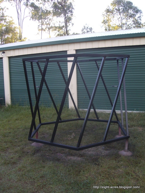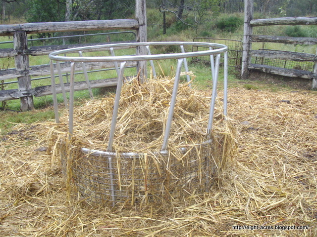 Later, when we were very busy and in need of a round bale holder, we bought the simple one pictured below. It is made from three pipe hoops, pipe uprights and mesh at the bottom to stop the hay from spilling out. It works very well, but with the new property we needed a second round bale holder and didn't want to pay for something that we could make, now that we had more time to work on it.