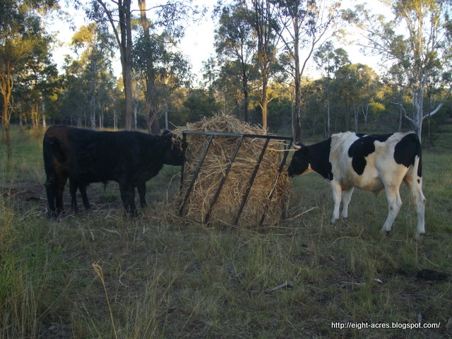 Round bales are a cheap way to buy hay for stock when the grass dries off in winter or if you're keeping them in the yards. Round bales without round bale holders don't last more than 24 hours with our cattle! They tend to pull the whole thing apart and then lie down in it, poo in it and refuse to eat the rest. It makes a very expensive pile of mulch! With a good round bale holder, most of the hay will be eaten and only the stalks are discarded, but the holders are expensive to buy, around $400 in our area.