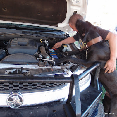 In preparation for our trip away, Pete installed a secondary battery system in the car and Gus was more than happy to help both under the bonnet and under the car. He also demonstrated that he can jump on the back of the ute if he wants to. Pete did a great job and we can now charge our secondary battery to run our travel fridge and buy lots of food when we go away! (I wrote about this back here)