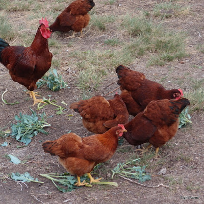 The hens are laying well again, although they are losing a few feathers (from the heat and nothing more serious I hope). We have been letting them free-range as much as possible so that they can find some shade. We've had two older ones die, one who was clucky for ages, I think she just got too hot on the nest, even though I kept moving her off it. We're not going to hatch any chicks this year (sad face), so we don't have too many animals to move later in the year. Don't worry we still have plenty of chickens, I haven't counted them for a while, but its around 16 hens and 2 roosters. We also have the 2 bantams and I've started letting them free-range too after my friend who gave them to me told me that she used to let them out with the big chickens. I thought the big chickens would pick on the bantams, but the big chickens just ignore them, so they wander around the yard together like Camp Mother and Camp Leader on little adventures!
