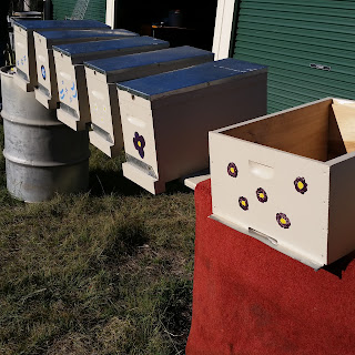 We prepared more 'nucs' and I painted the front so that the bees don't get mixed up (apparently that is a real problem for them). More about filling the nucs in my permaculture discussion below.