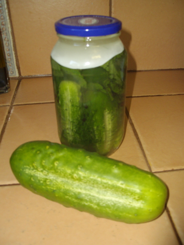 Before I put the pickles in the fridge I took them all out of the jar and strained the brine to pick out the dill and mustard leaves, as I didn't want them to go slimy, and then replaced the pickles and the brine in the jar. Of course we had a little taste as well, and they were very nice. A bit crunchier than vinegar pickles, a bit saltier and slightly less acidic, the dill smells delicious too! I'm really pleased with them and will be making some more as soon as there's a few more big ones ready.....