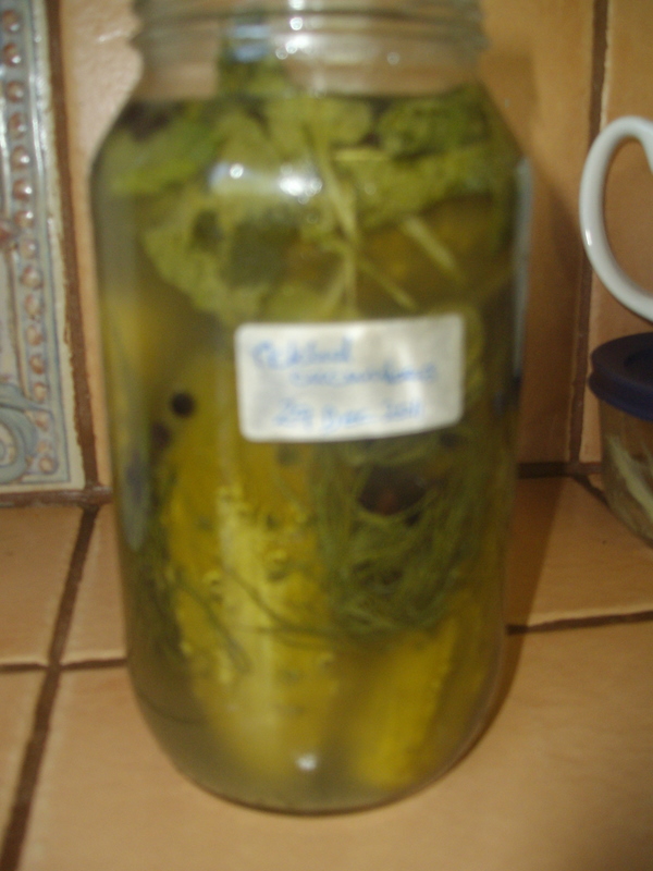 I used this method, but I didn't have grape leaves, so I used some mustard leaves, and I added a little whey to get the process started (and use up the whey), as suggested in Nourishing Traditions. Lucky I planted lots of dill earlier in the year! The hardest part was finding big enough jars, I'm looking out for them at op shops and trying to build up a decent collection. I used a piece of plastic cut from a margarine lid (very old lid, don't eat that "food" these days!) as the "follower" that's supposed to keep out air and allow the lactic fermentation to proceed. I didn't use anything with my sauerkraut, but I've read in a few places that I should have.