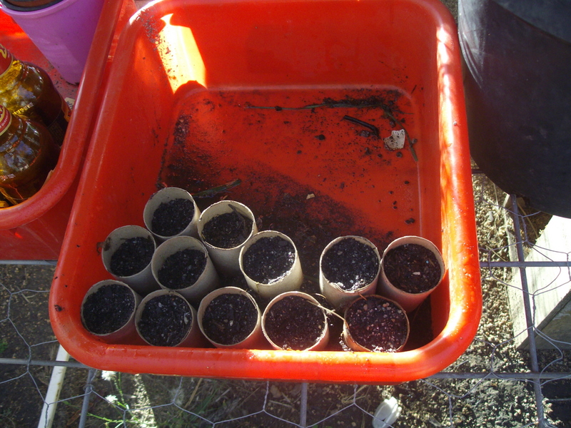 I have had very limited success with planting seeds directly into my garden, I think its just the clay soil, its too heavy and the clods are too big, I also blame the slugs which have eaten baby seedlings to the ground before they get a chance to grow! Strangely though, things that I haven't planted intentionally keep sprouting up in odd places this year, like beans and tomatoes, so I don't know what I do wrong when I WANT to plant things! Anyway, this means that I mainly stick to planting in separate containers and transplanting into the garden. This gives me control over the soil, the water and shade for the seedling (as well as being more work as its something else to water). I did use the seedling trays from seedlings that I had bought previously, but I find them too shallow and they dry out too quickly. Since then I've been using big red tubs and planting into either toilet rolls or small pots. I keep some water in the bottom of the tubs so that the seed beds never dry out (even though this is supposed to cause root rot, I've had no problems with it). The toilet rolls can be planted directly into the garden, which is good for plants that don't like to have their roots disturbed by transplanting. For less delicate plants, I will plant a few in a small pot and then move them when they get too big.