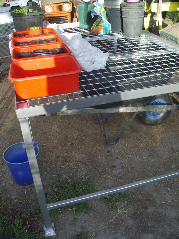 At first I made a seed raising bench from at old gate propped up on some old boxes, but then my fabricating husband came to the rescue and built me a lovely new table. Note also the old net curtain that I pull over the seedlings to stop the soil drying out and deter the birds.