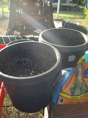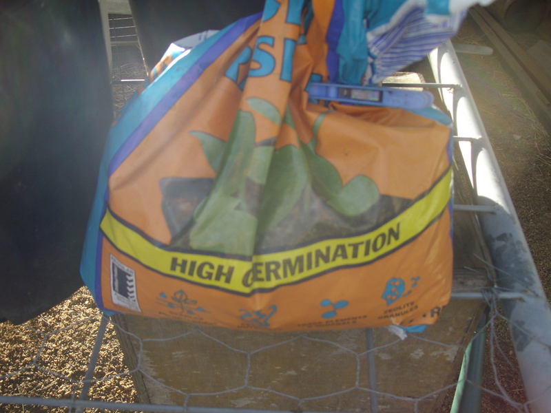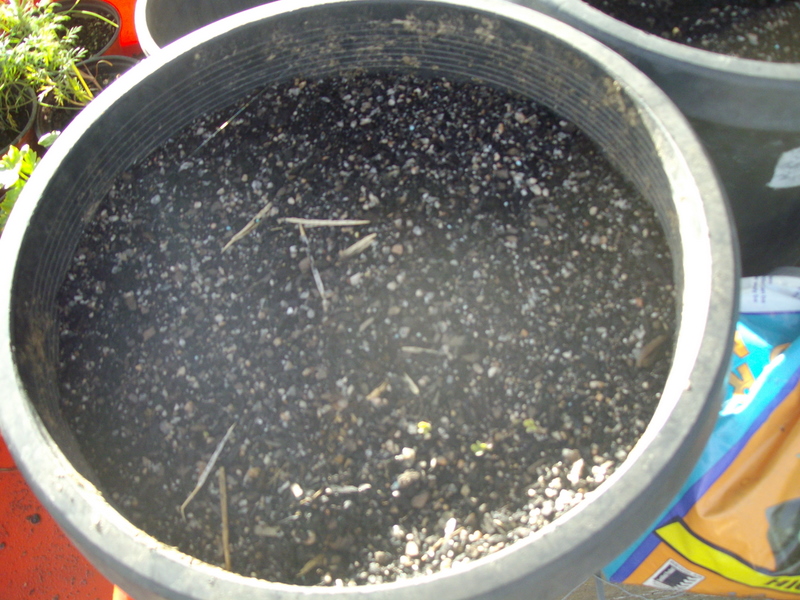 For larger seedlings, or small seeds where you just want to broadcast a whole lot of them, I use a large pot. I don't want to fill the entire pot with seed-raising mix, so most of the pot is compost, with a layer of seed-raising mix for the seeds to start off in. That means that the whole pot can hold moisture and provide some nutrients to the seedlings as they get started.