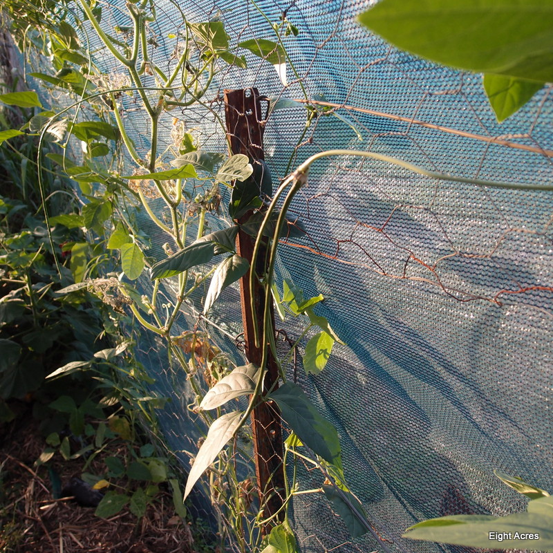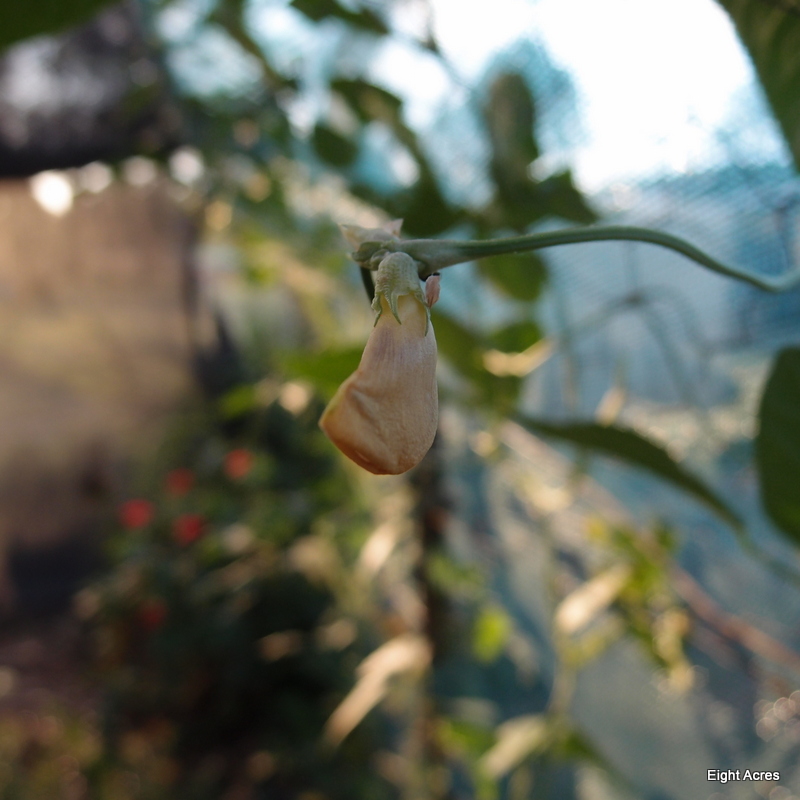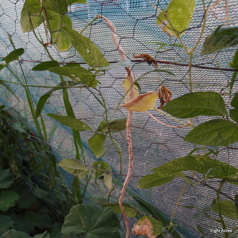 Vigna unguiculata subsp. sesquipedalis also known as yardlong bean,long-podded cowpea, asparagus bean, pea bean, or Chinese long bean. You might have guessed from that, it is a LONG bean, up to 30cm in my experience. Apparently sequipedalis means "one and a half feet", so it must get even longer in some conditions. It is a different genus to the common bean and more closely related to cow peas and mung beans. Snake beans grow on vines and seem to prefer hot and wet weather, but will tolerate dry better than common beans, and will certainly produce better in the heat. Like common beans, they do not survive frost and start to die back when overnight temperatures cool off. The plant produces two flowers off each stem and these grow into beans, sometimes it seems like its overnight, but they can be hard to spot because at first they just look like stems and then suddenly you realise the vine is covered in beans! They are also really hard to photograph, as you can see. Any that get too big can be left to dry off, and used either as dried beans or seeds.