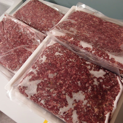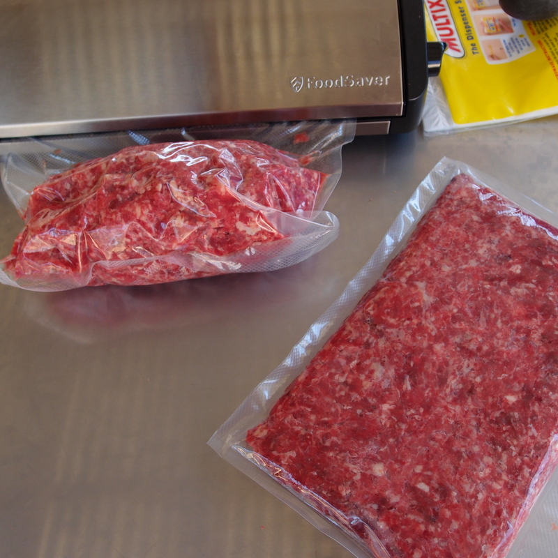After you seal a packet of mince (ground beef) you can then smooth it out flat so that it will stack neatly in the freezer. This also works with casserole meat. I try to keep the steaks flat too.