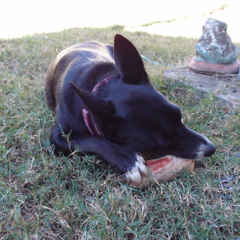The butcher arrived at 7am, and we kept Taz inside for most of the day, but by 1pm I thought she might need to come outside for a wee. Of course she then had to check out what the butcher was doing, but she left him alone when we gave her a bone to chew on.