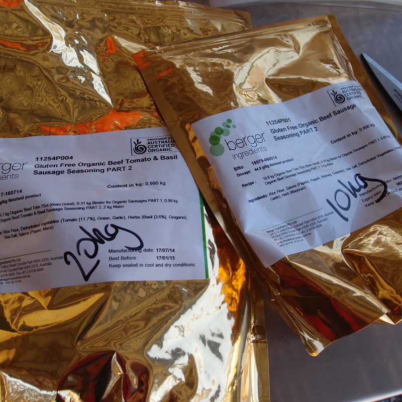 Our butcher is used to us now, and knows that I prefer to make my own stuffing for the rolled roasts, and that we buy organic sausage mix and natural hog casings. We also need to respect his time, it does take him longer to make things they way we want, so we have to have everything prepared before he arrives.