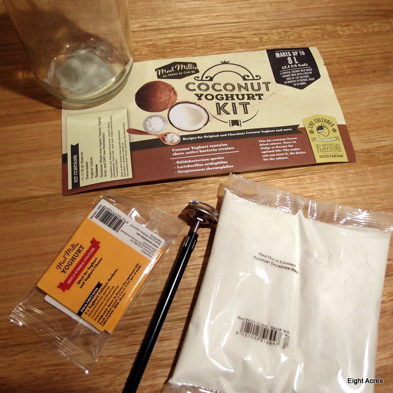 The Mad Millie kit includes the thickener and the culture. You need to provide the coconut milk/cream and the sugar. I can get $1.70 for 400 mL, so this works out way cheaper than the commercial coconut yoghurt options.