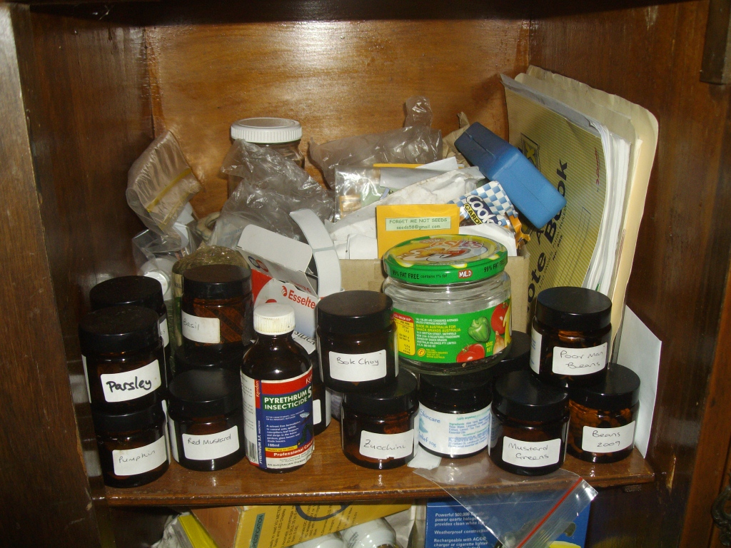 I have saved seeds from beans, capsicums, lettuce, mustard greens, tomatoes, parsley, basil, broccoli and spring onions, as well as flower seeds. I keep the seeds in little jars from my Damadi moisturiser and have a cupboard full of tiny jars. I also keep the little sachets of desiccant that come with shoes and other products and drop one in each jar to keep the moisture out.