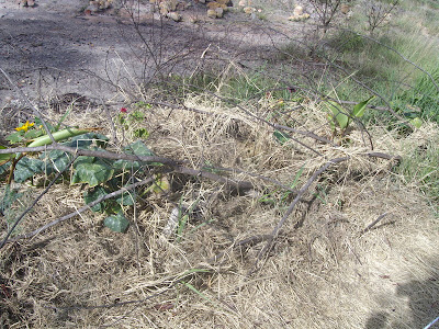 Unfortunately the first part of this summer was not as wet as initially forecast, and the occasional 10 mm of rain here and there, interspersed with impossibly hot days, was not enough to sustain all the plants, particularly with no shade over the mound, and some plants didn't make it. I tried to be blase about the hugelkultur, but I did end up taking water buckets up there and giving it a few drinks, just to keep something going (if only the microbes and the worms). Now finally it has rained, and I can see that some of the plants are doing well. Its quite fun having it as an overflow garden. It doesn't matter what survives and what doesn't. It doesn't matter if I don't ever harvest anything, and it doesn't matter if its full of weeds, as long as something is growing up there and starting to establish some top soil on the slope.