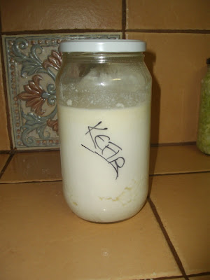 If you haven't heard of kefir, it is a mixture of bacteria and yeasts that grow in milk (or sugar water, see below) and are beneficial to your digestion. The microbes grow to form solid "grains" which can be harvested and used to inoculate fresh batches of milk, they are not really grains, just globs polysaccharides produced by the microbes. The "kefirred" milk is then drunk, either neat or in a smoothie. The taste is like very strong blue cheese with a hint of fizzyness. If you put it in a smoothie with banana you can't even taste it (just we haven't had cheap bananas here since a cyclone knocked out the north QLD banana plantations, hope they re-grow soon, $13/kg means we don't buy them often!). There is a much more detailed explanation on Craving Fresh. Basically, you leave the jar of milk and grains out on the bench for a few days until you start to see some action, then you strain out the grains and use the milk, starting a new batch with the grains and fresh milk. If you have too much keffired milk or want to leave it for a while, you can put the mixture in the fridge, where it will grow more slowing, just needs a milk top-up occasionally.