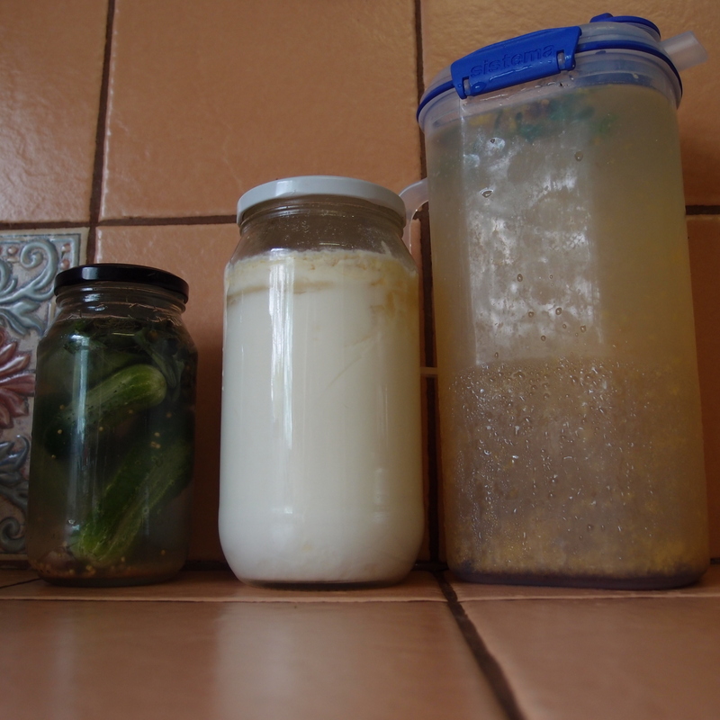 | kefir "grains" in the jar, and kefirred milk in the jug |