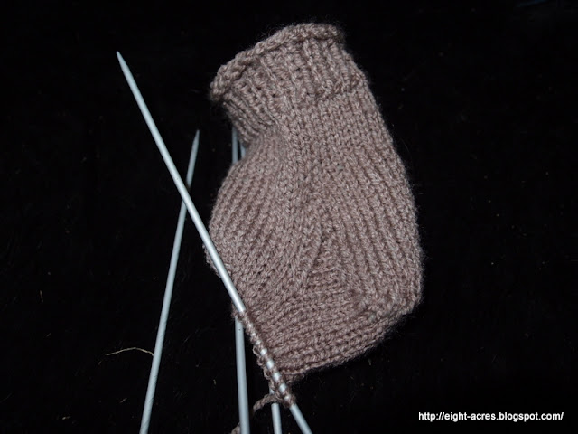 Continue until you have the original number of stiches back on the needles. In this case it will be 20 stitches on the top needle and 10 on the other two needles. Now you just work around and around, try on the sock occasionally and continue around until you reach about 1 inch from the toe of your foot.
