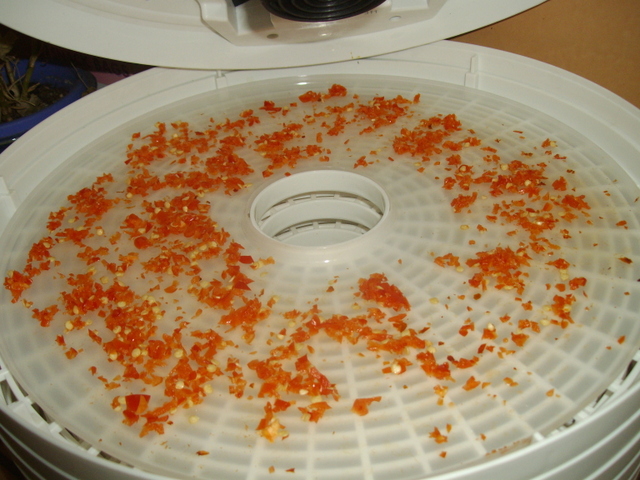 I used the solid tray in my dehydrator to dry chilli flakes. I just put 4 chillies in the blender (tops cut off and chillis cut in half, for some reason I made the mistake of putting my head over the blender and inhaling deeply to see what it smelled like, woo wee, not a good idea unless you need to clear your nostrils!), and scraped the resulting chopped chillies onto the tray (this is a very exciting success for the blender as I hate chopping chillis, you can never quite wash the hotness off your hands and then you have to be very careful where you put your fingers!). The flakes dried over a few days (with only a couple of hours of drier operation, my strategy is to run the drier when we're at home and leave the herbs/flakes etc in the drier for a few days to air dry naturally). I will keep making more as the chillies ripen and we will have chilli to use over winter.