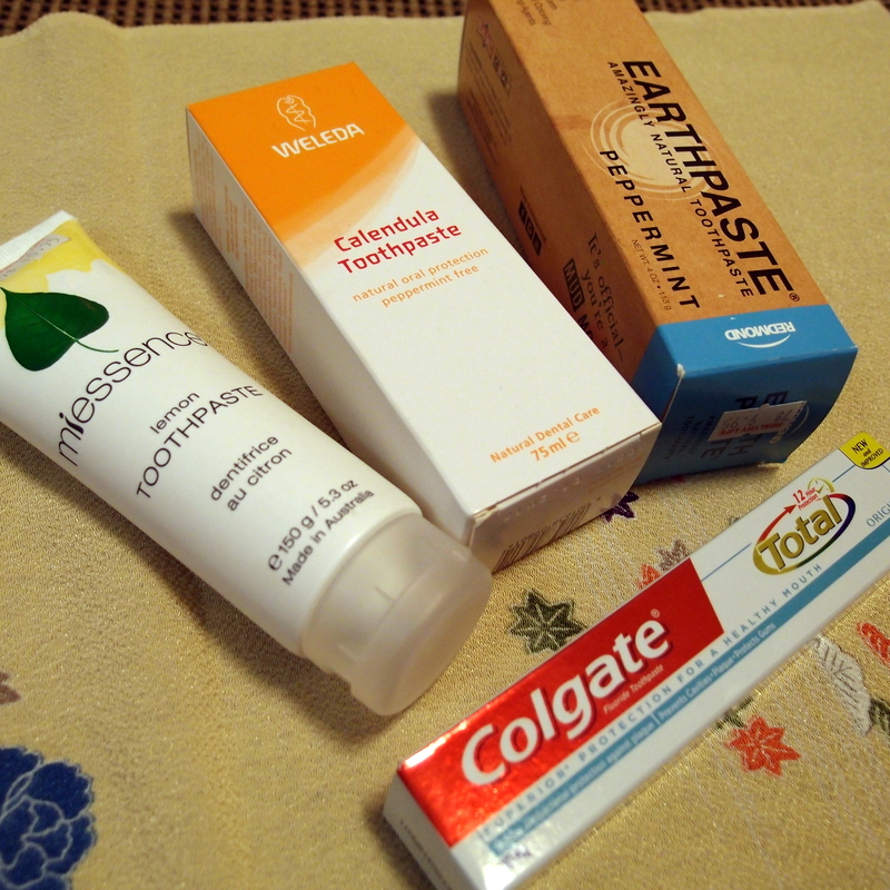 Remineralisation is the concept that teeth decay can be repaired through normal cell regeneration if you eat a diet rich in minerals and fat-soluble vitamins, and add minerals to your toothpaste (more here and here). In particular, the minerals calcium, phosphorous and magnesium need to be available. There are many different recipes for homemade toothpaste and I wasn’t sure which one to use, so last time I went to buy toothpaste, I bought one of each brand available in the shop so that I could compare. If you don’t want to make your own toothpaste, you could choose one of these natural options as an alternative to commercial toothpaste.