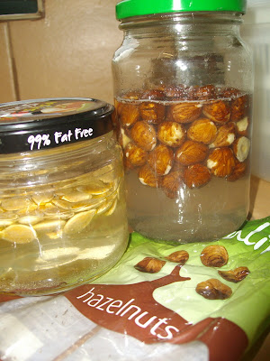 I had half a packet of hazelnuts in the cupboard that I had never felt like eating, so I tried soaking them in brine and drying them in my dehydrator. They came out really nice and I am able to eat them comfortably. I also tried to make pepitas from raw pumpkin seeds, but they never went crunchy, just chewy, so I gave up on that one!
