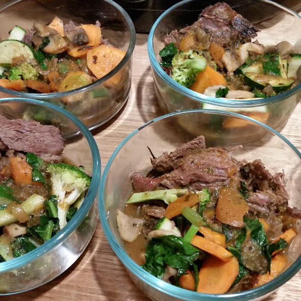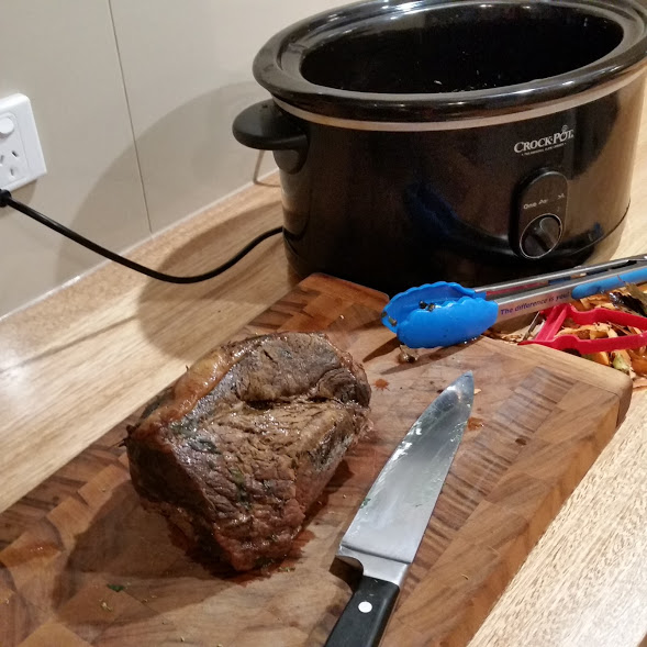 We are on a mission to use up the beef from our last homekill (over a year ago), there are just a few roasts left and this was one of them. I cooked it in the slowcooker with beef stock, onion and carrot, a little wine, bay leaves and rosemary. As usually, we ate it with lots of veges. Similar to the rolled roast from February.