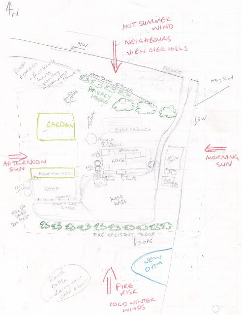 When considering wind and fire, we planned to (and eventually did) build another dam in a hollow between the house and the main fire risk. We will also have a clear area of road base around the house and a hedge of fire resistant bushes (not sure what yet). The grass in that area will be kept short by the dairy cows and we will clear the undergrowth from beneath the tall trees.