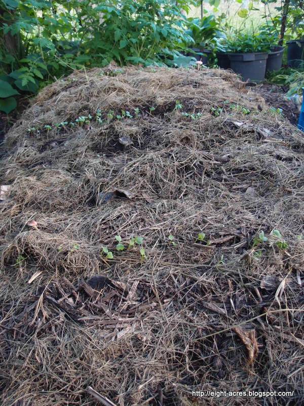 radish seedlings peeping through the mulch