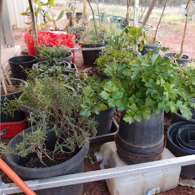 I'm still here! I just got distracted by making a new soap website and I couldn't decide where to post this. But I'm not ready to move just yet. I wanted to show you my pot garden as I've been pleasantly surprised by what I can grow (in winter anyway). We are going to build a proper garden and set up the aquaponics, but other things need to be done first and meanwhile my pot collection keeps growing every time I go to our monthly share meeting and come home with another herb!