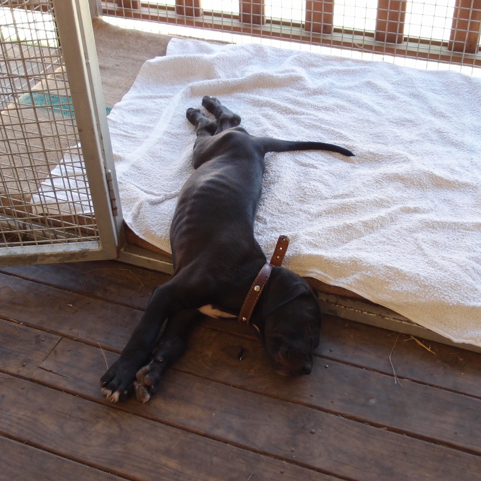 Poor Gus did not like being in his box at first, but now he is used to it, he will hop in there anytime he needs a break. For the first few days we put Gus in his box anytime we were away and overnight. After that he made himself at home in Taz' bed overnight, so I left him there. The first morning that I had to leave for work, I had given them a bone each, but still Gus was crying so much that Taz just stood and barked at him! I had to leave them to it (sorry neighbours!). Fortunately things have improved, and although he may still whinge a little, I think he's pretty happy in there now.