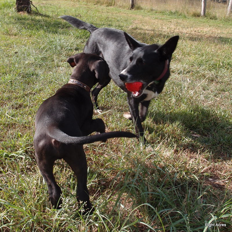 Taz has been a great source of babysitting and they will play endlessly. If Gus can't get the toy he will leap on Taz and bite her neck. She then has to drop the toy to bite him back. So far its all been good fun, but I'm relying on her to teach him some doggy manners if he starts to bite too hard. Its better coming from her than from us. A friend also suggested that teaching him to play ball will help to focus his "prey drive" so he might leave the chickens alone (as Taz does).