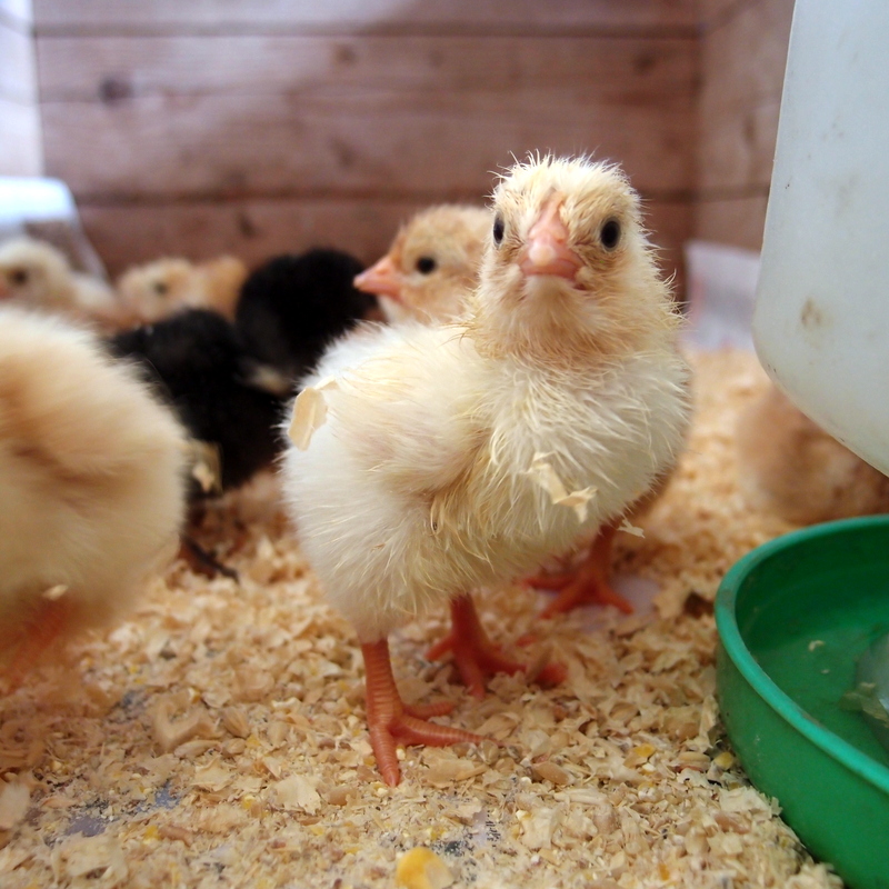 I’m not sure if this really necessary, but we usually “teach” the chicks to eat their food by tapping a finger in the food dish. This results in lots of chicks running over to your hand to see what you’re doing and a few will then try eating the food. After that, they are usually pretty quick to work out where the food is.