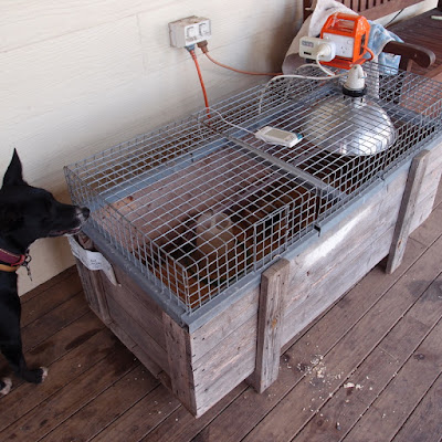 We heat the box using a heat lamp and thermostat designed for reptiles. We have both a 60 W and a 25 W ceramic bulb, which we vary depending on the outside temperature (sometimes the larger bulb is too hot, or the smaller bulb not hot enough). The top of the box has a metal mesh frame, to stop the chicks flying out and to stop the dogs helping themselves. You can also use incandescent lightbulbs (if you still have any!) and a thermometer to monitor the temperature in the box. The chicks will tell you if they are too cold, they all huddle under the lamp, and if they are too hot they will be in the opposite corner of the box panting.