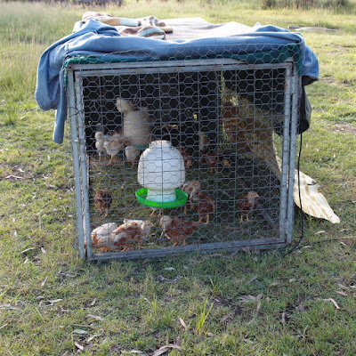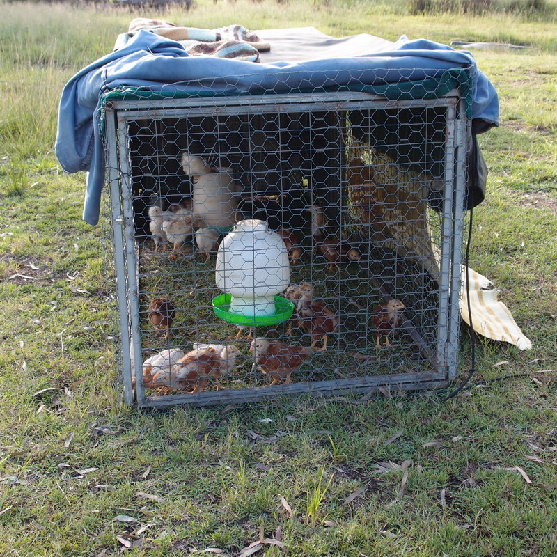 Even though it is warm enough, we find that when we put chicks out in the tractor for the first few nights they need to 'tucked in' at dusk because they are so used to living in a box and not having open sides, its quite scary for them. This means draping tarps, old sheets, towels and blankets over the tractor so that they feel like they're still in a solid box. Otherwise they spend the night trying to stick their little heads out of the mesh and sometimes they manage to squeeze out. We only have to do this for about a week until they get used to it. This also helps to keep the dew off their grass and keep out any draughts, while they acclimatise to not having the heat lamp above them at night.