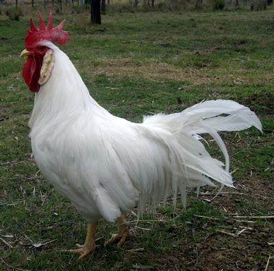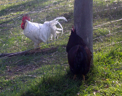 We usually keep several roosters for our breeding program, at the moment we have three, each with a small flock of 3-4 hens, and at times we have even more if we're raising cockerels to eat as well. The roosters have to be kept separate as they have a habit of FIGHTING TO THE DEATH if they get close enough to each other. Our three roosters are separated by chicken mesh fences, but this doesn't stop them challenging each other. I'm not sure if they have really short memories, but they seem to be really surprised to see each other each time they are out of their cages. On an almost daily basis, Randy the Rhode Island Red will spot Ivan the White Leghorn on the other side of the fence and launch an attack. This involves running at full speed toward the fence. Anyone who has seen a rooster running at full speed will know how funny this looks, head down, tail up, wings aerodynamically folded down and the lurch from side to side that only happens at high speed. When they get to the fence they face each other and mirror each other's movements, bobbing up and down, eyes locked, until one of them, usually Ivan, loses interest and wanders away. Randy then spends several minutes patrolling up and down the fence and calling out to the other rooster (probably calling him chicken), until he realises that he looks like a fool and wanders away too. If the fence wasn't there, the resulting fight (and we have a had a few when roosters have sneaked around/through the fence) involves much frenzied wing-flapping and kicking. Once separated, the roosters are often bleeding from their combs, panting heavily, but determined to continue the fight at the first opportunity (did I mention that they're stupid?).