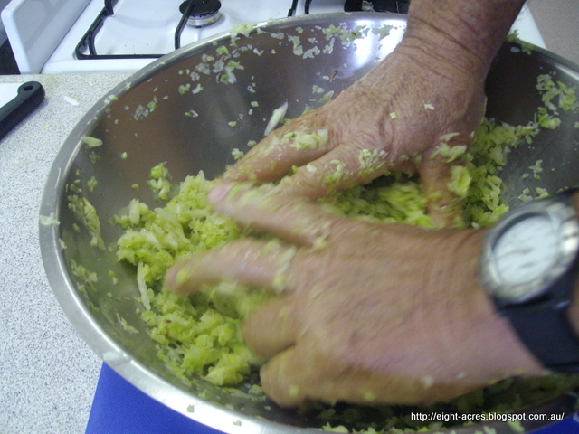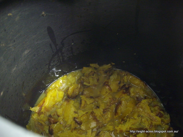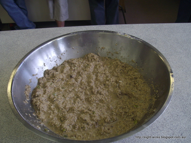 This was similar to the sauerkraut except we used a wombok cabbage, chopped quite large and only bruised with the end of a rolling pin, rather than squeezed. Elisabeth added chilli powder and paprika, and this time a little whey, and packed the mixture into a small bucket, with a saucer inside and weighted down with one of the jars of sauerkraut! I tried kimchi for the first time at the workshop lunch and really enjoyed the taste, so I will try making this. I just need to plant some womboks!