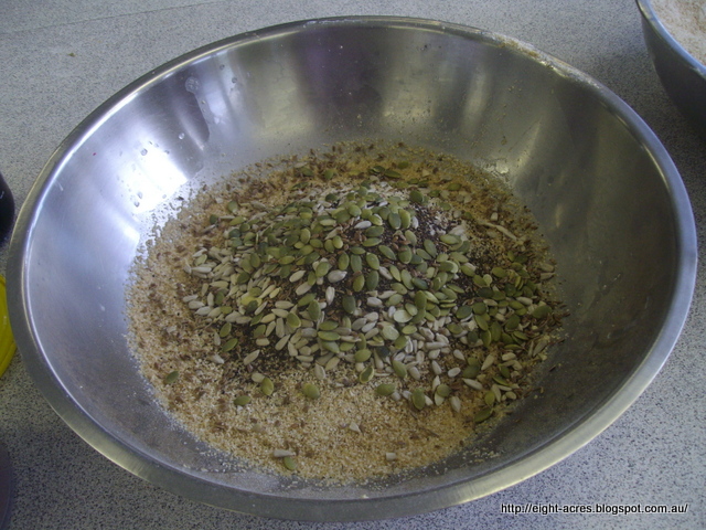 We then learnt how to make the sponge by adding a small amount of either another sponge or leftover dough to water, and then adding other ingredients. For this bread we added wholemeal flour, a little salt, pumpkin seeds, sunflower seeds, linseeds, caraway seeds, kelp, molasses and carob. We mixed it and added water until the mixture was fluid enough.