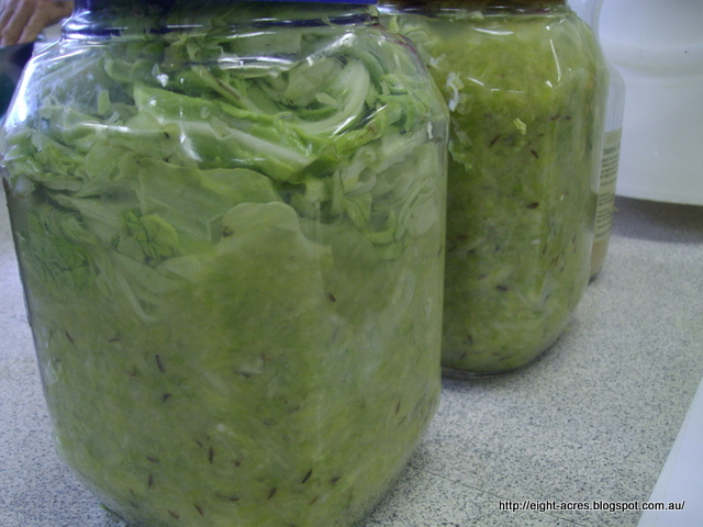 We finely chopped a couple of cabbages and then the cabbage was squeezed and squeezed until the juice started to come out. Elisabeth added a little salt and caraway seeds, and then the cabbage was packed into jars. The cabbage was held under the liquid by scrunching up some of the outer cabbage leaves under the lid. I have to say that the squeezing method was more effective and less messy than my attempts with a meat hammer, and I like using the scrunched up cabbage leaf instead of the plastic insert that I made. I added whey to my sauerkraut, and there is some debate on the net about whether this is necessary. Clearly sauerkraut can be made without whey, but as it worked for me, I think I'll continue adding whey. Next time I will be chopping my cabbage finer and squeezing it by hand.